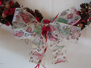 Continue on from there without cutting the ribbon, wrapping it around the wreath over the wire. You should glue it in place over the wire, in several places so it doesn't move off with wear.